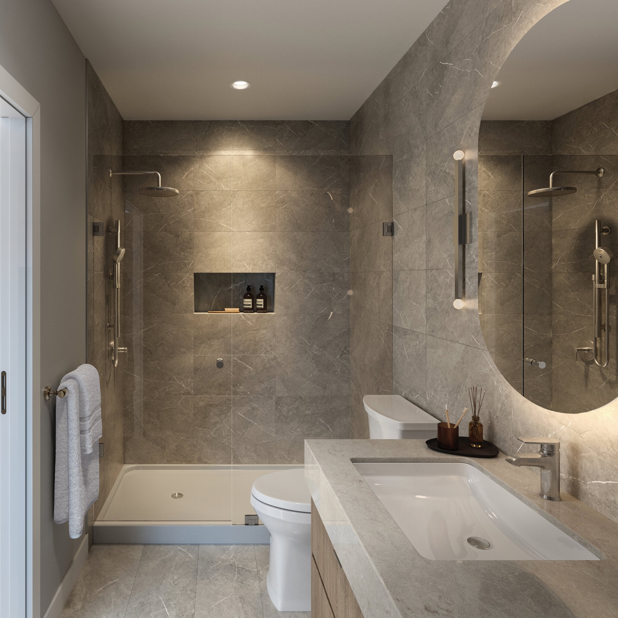 Back-lit mirrors, slab-edge countertops, tiled vanity walls and modern matte fixtures make your ensuite a restful retreat.
